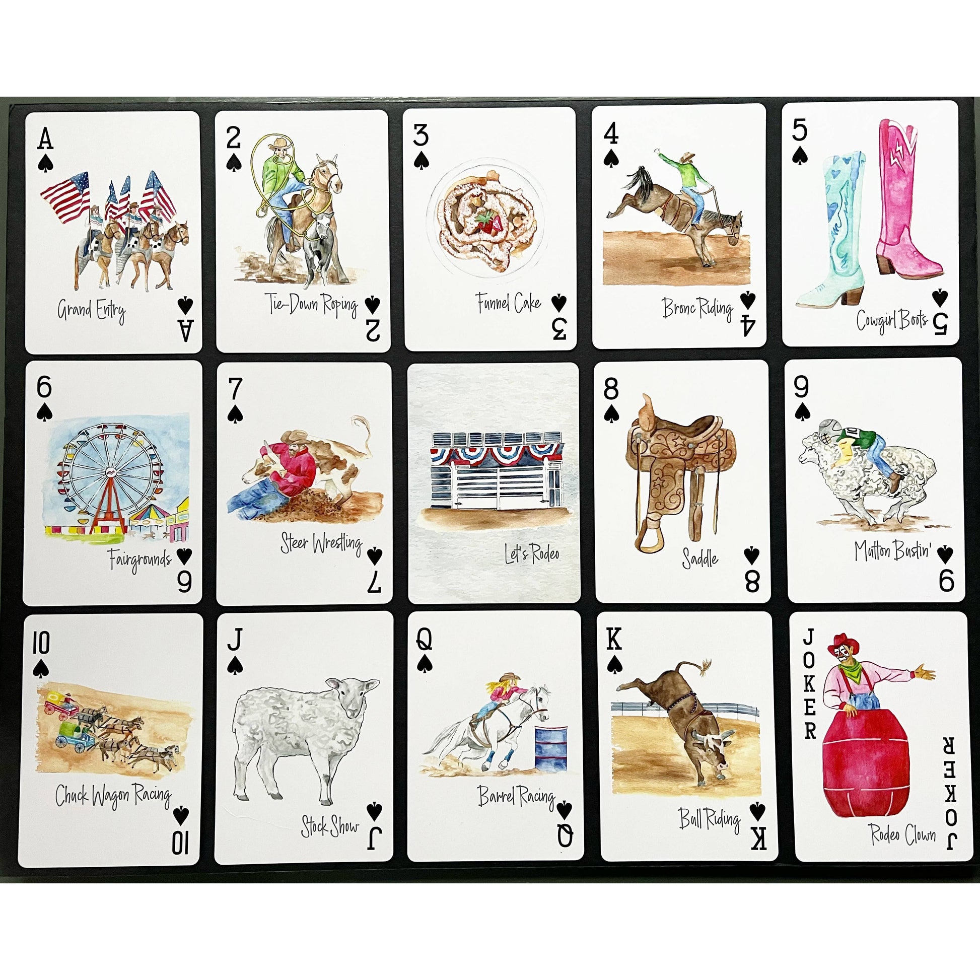 A Rodeo theme deck of playing cards featuring popular rodeo watercolor imagery, including Grand Entry, Tie-Down Roping, Funnel Cakes, Corn DogsBronc Riding, Cowgirl Boots, Cowboy Boots, Spurs, Squash Blossoms, Fairgrounds, Steer Wrestling, Saddles, Mutton Bustin', Chuck Wagon Racing, Stock Show Animals (goat, sheep, corn and pig) Barrel Racing, Bull Riding and Rodeo Clown.