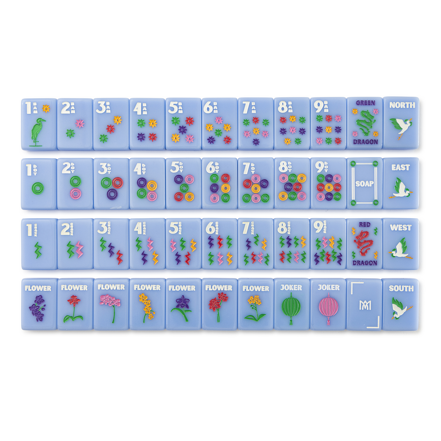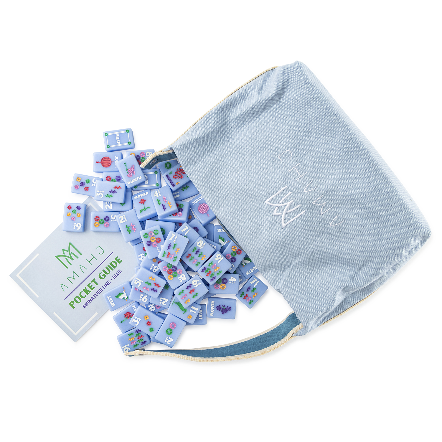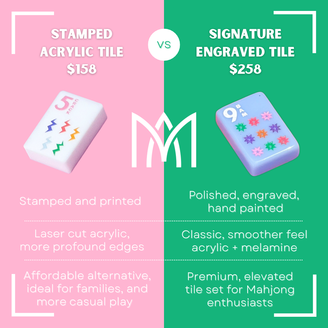 The Amahj Signature Sets are the creme de la creme of Mahjong Tiles. Our Signature Sets are elevated, unique, and feature hand-engraved and hand-painted tiles from China, the birthplace of Mahjong. Unlike any other tile line, all Amahj tiles are all distinctly labeled to facilitate easy play and learning. Crafted in limited editions and meticulously hand painted and hand crafted, every set is distinct and may show minor variations in painting conisistency and hue. Included with each Amahj set is a signature carrying case and a convenient Amahj pocket guide. The sets consist of 160 tiles, each sized at 1" x 1 7/16" x 7/16", and are shrink-wrapped. The set includes: - 108 tiles of Bams, Cracks, and Dots numbered 1-9 (four of each) - 16 Wind tiles - 12 Dragon tiles - 8 Flower tiles - 10 Joker tiles - 6 Blank tiles