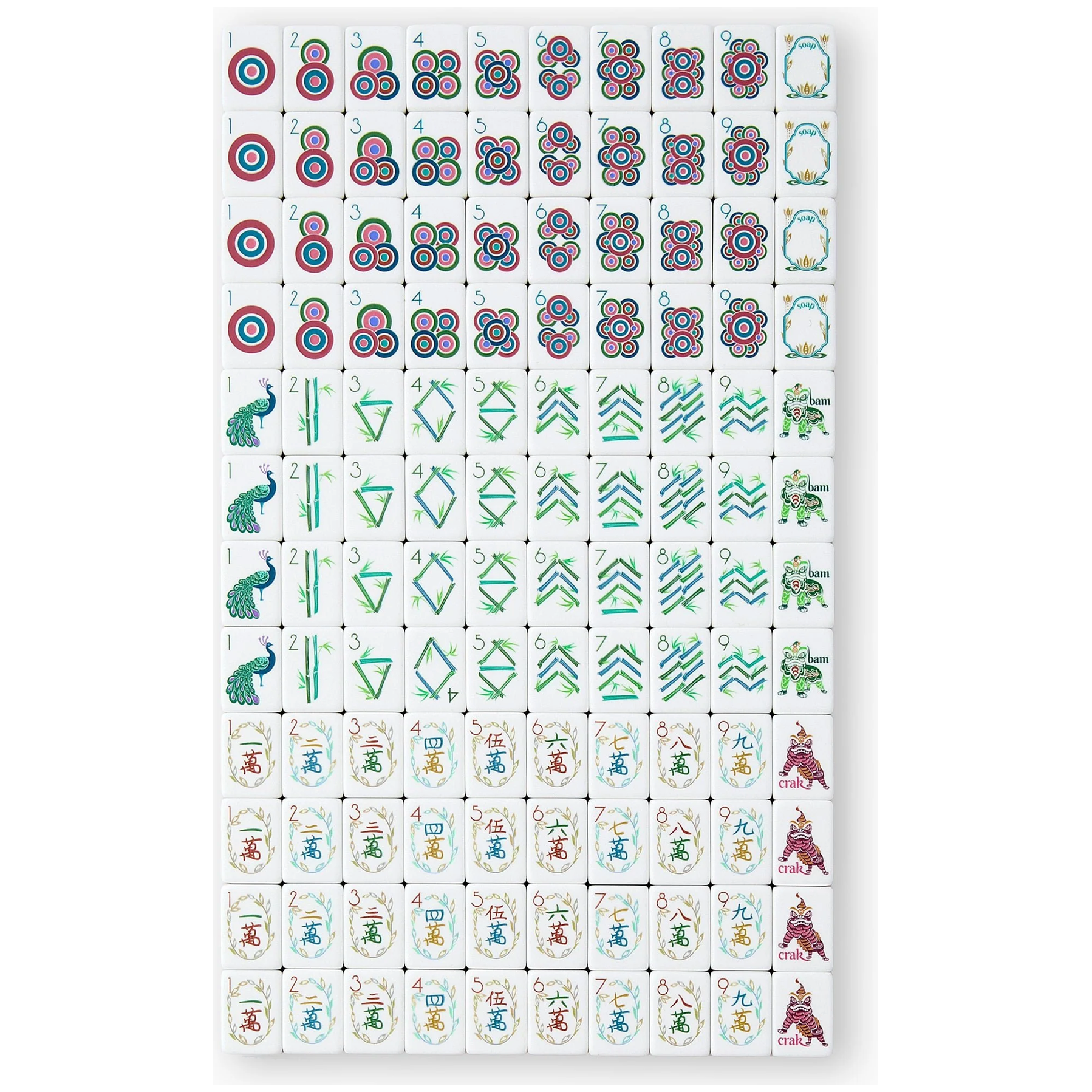 - 1-9 Bams, Cracks, and Dots (4 of each) = 108