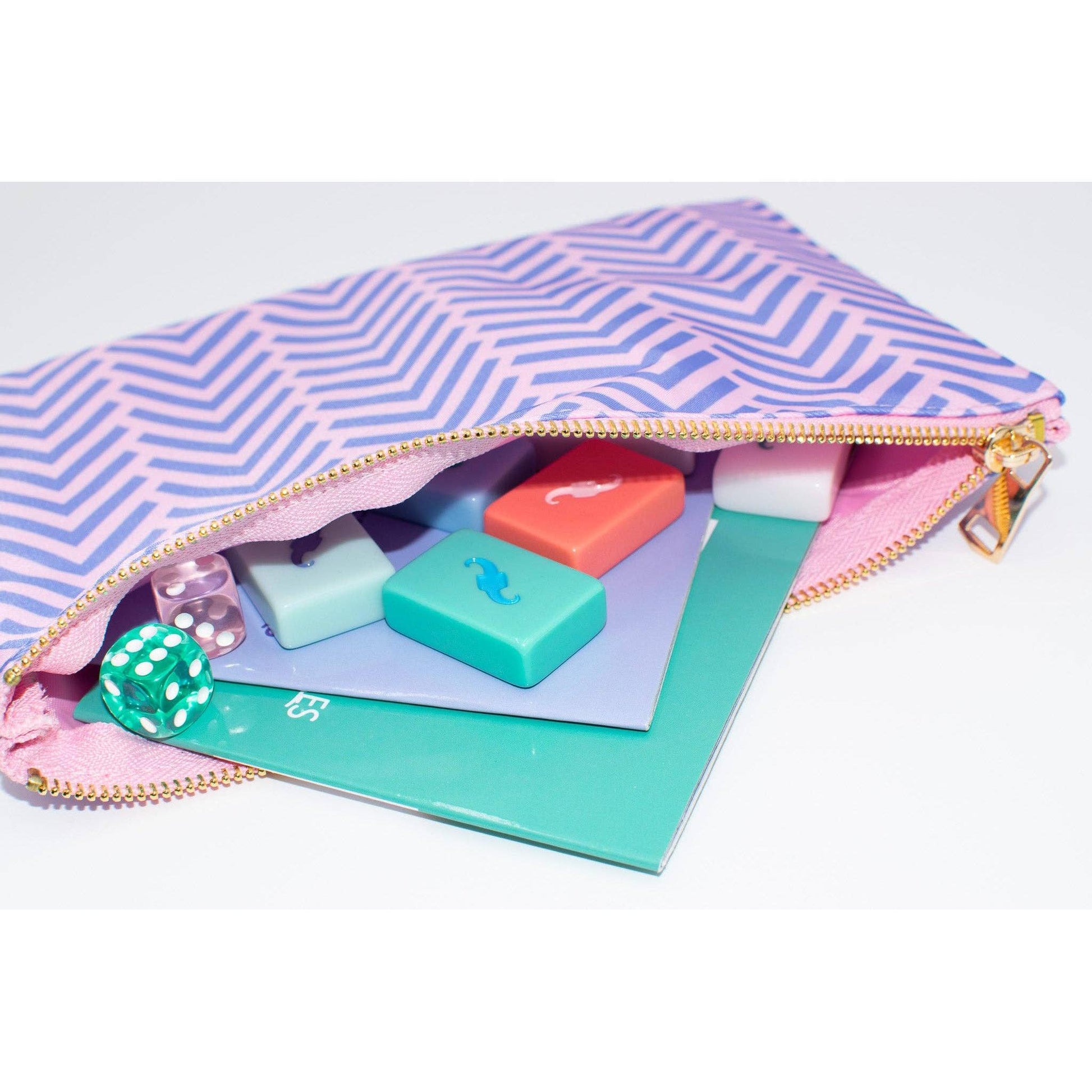 Introducing our Premium Card & Accessory Bags in a variety of colorful patterns and designs. These bags fit large mahjong cards, spare tiles, dice and many other small accessories. These bags coordinate with our premium tile, tote and rack bag options! Featuring a sewn-on rubber patch that says "MAHJ," this bag is a wonderful and stylish addition to your mahjong set and accessories. Pair with our rack or tote bags in a coordinated pattern and you're ready to be the envy of your mahjong group! FEATURES: * Mahjong Tile Bag with a sewn-on rubber patch that says "MAHJ" on one side * Accommodates large mahjong cards sized 5x7" and smaller * Dimensions: 8.25" x 6.5" * Materials: Nylon exterior, Polyester lining, copper zipper teeth and plated alloy zipper pull * Designs coordinate with our Tile, Rack and Tote bags