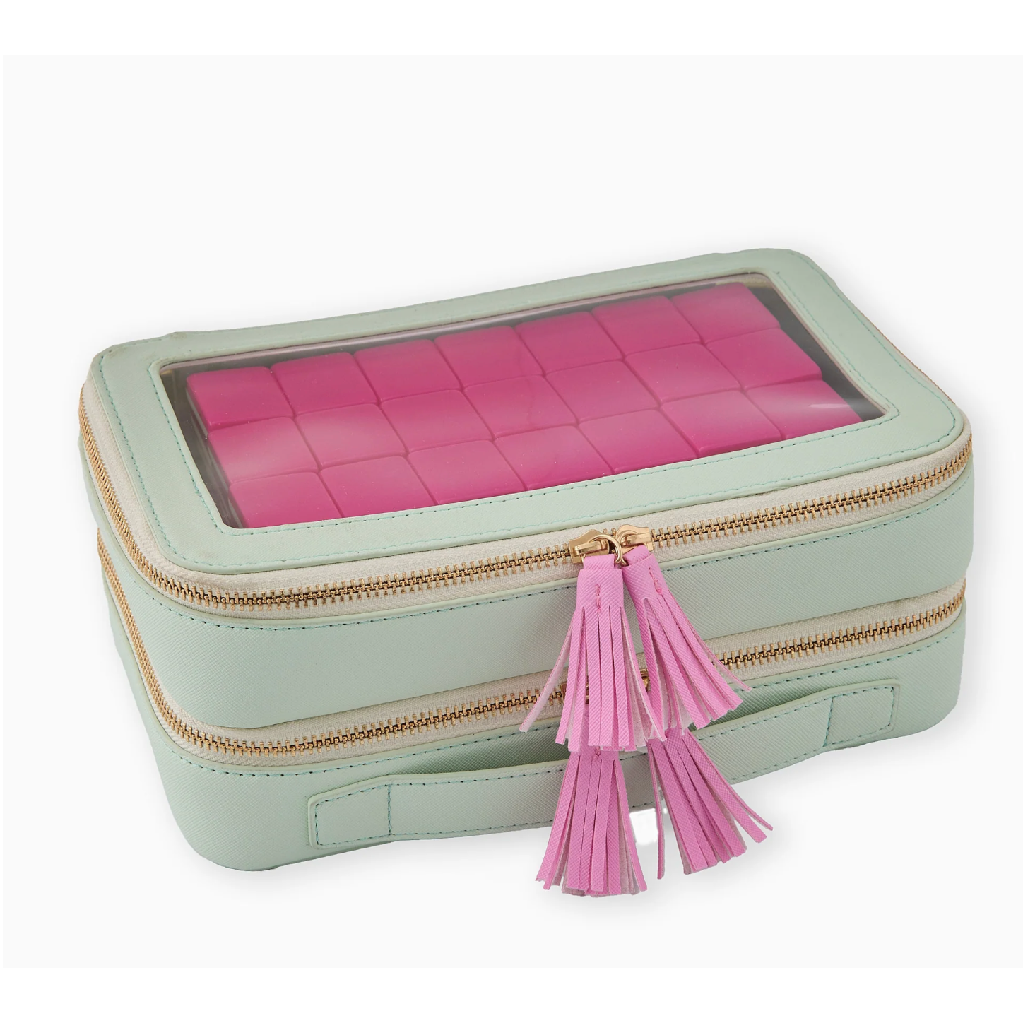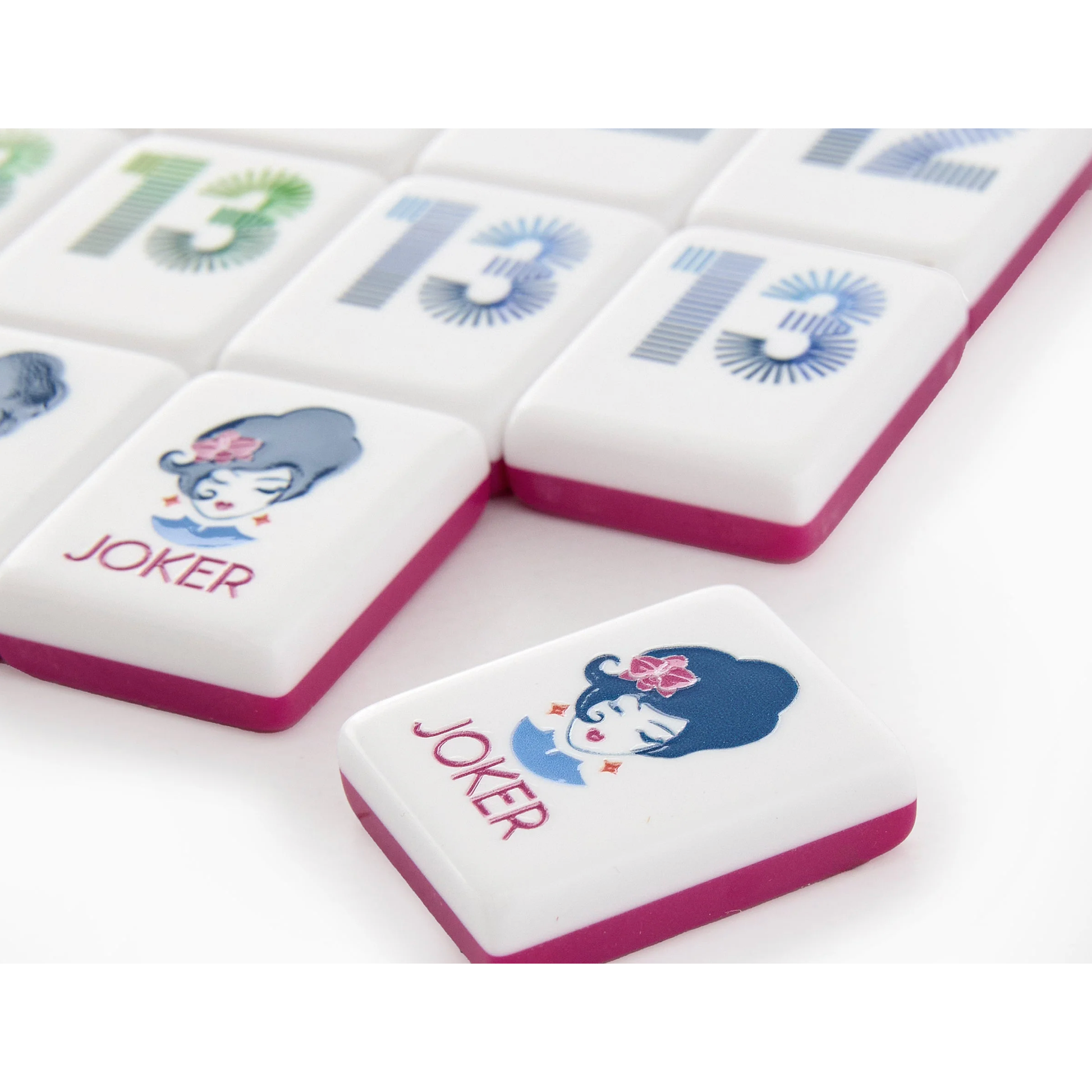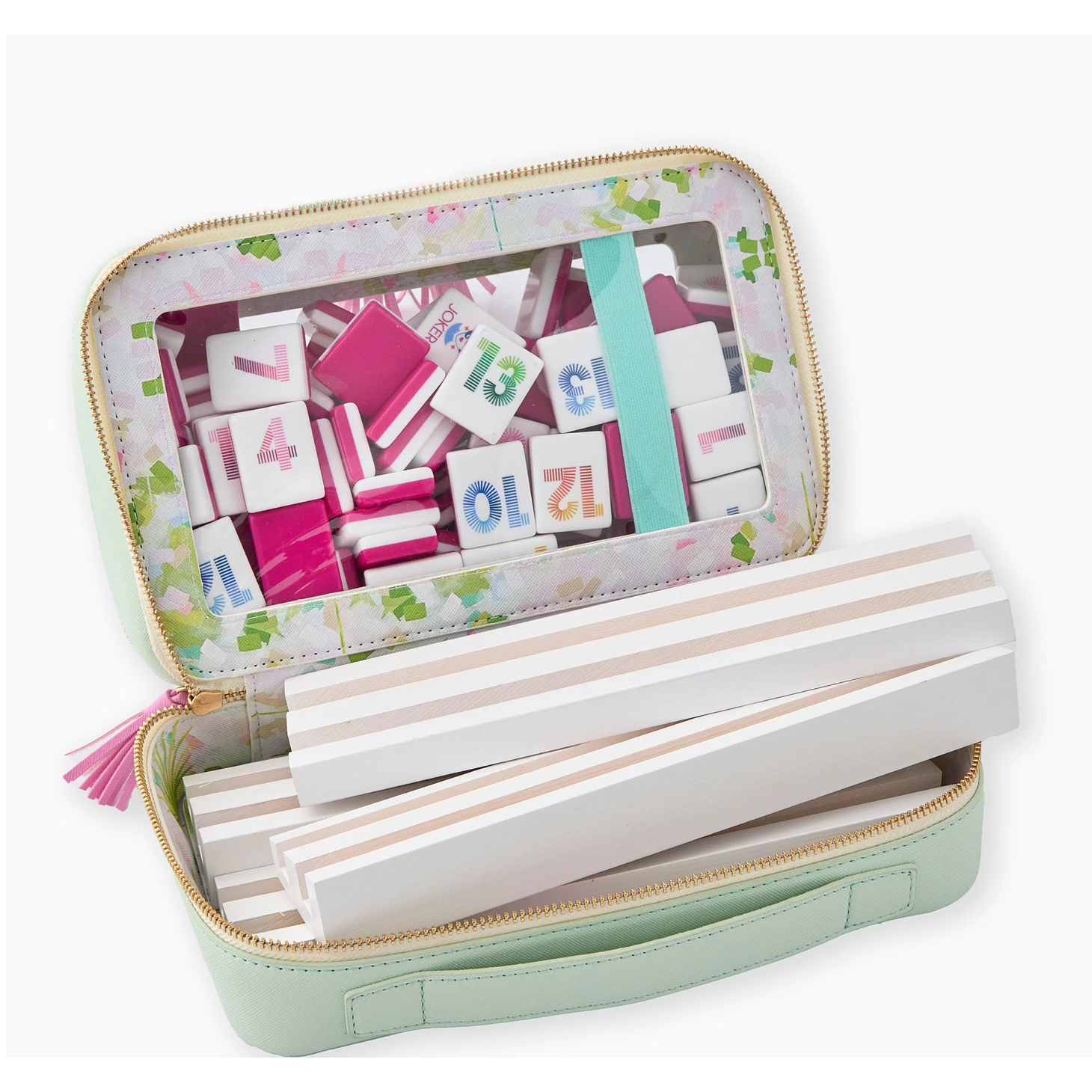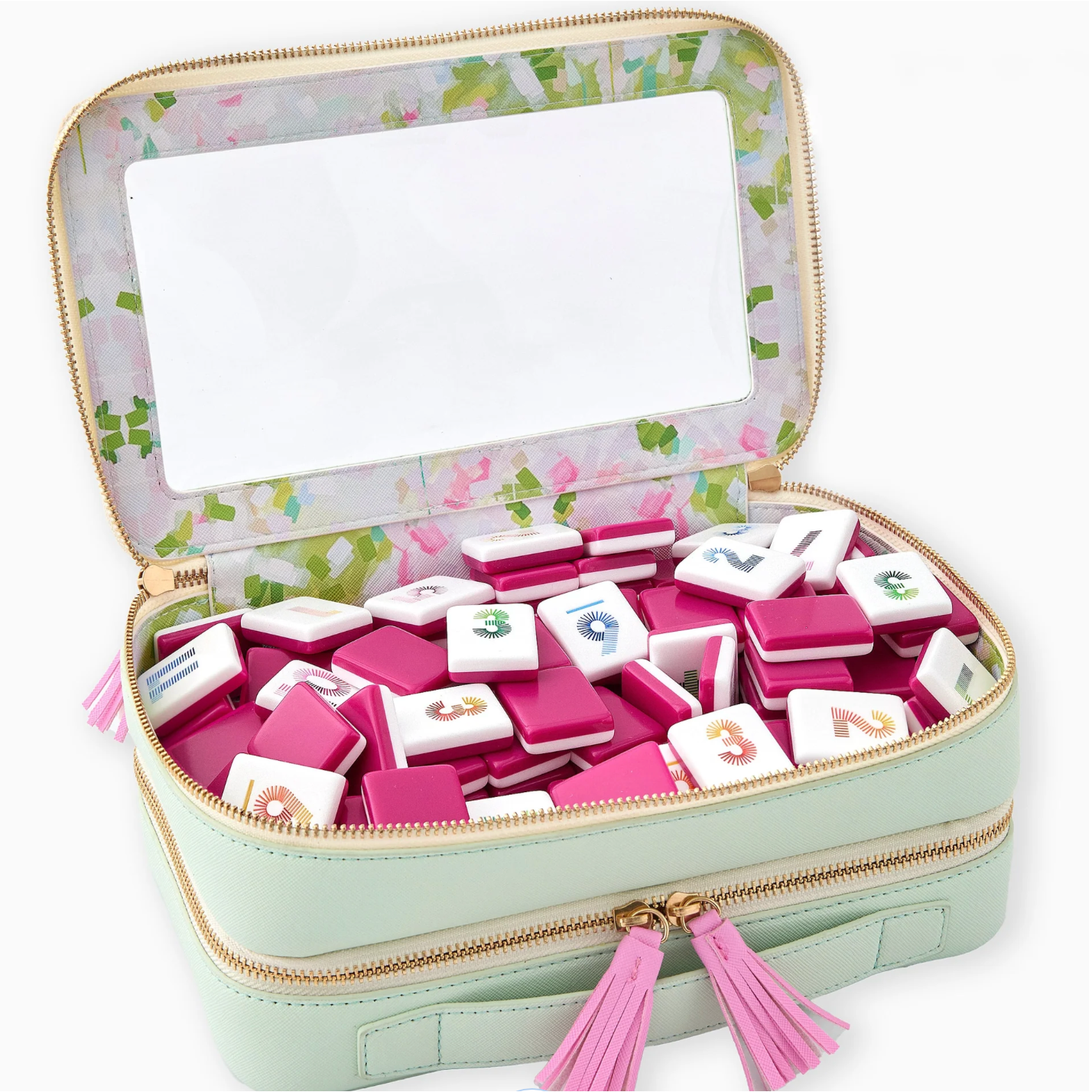 Introducing Confetti Oh My Rummi, a swoon-worthy set that brings vibrant fun and sophisticated charm to your game nights. The bright pink tiles are perfectly paired with a light mint carrying case, creating a delightful color combination that's playful and elegant. Inside the case, you'll find the stunning watercolor art from the Capri Mat, a collaborative design by Catherine Cartie and Emily Nichols, adding a touch of artistic flair and beauty to every game you play.