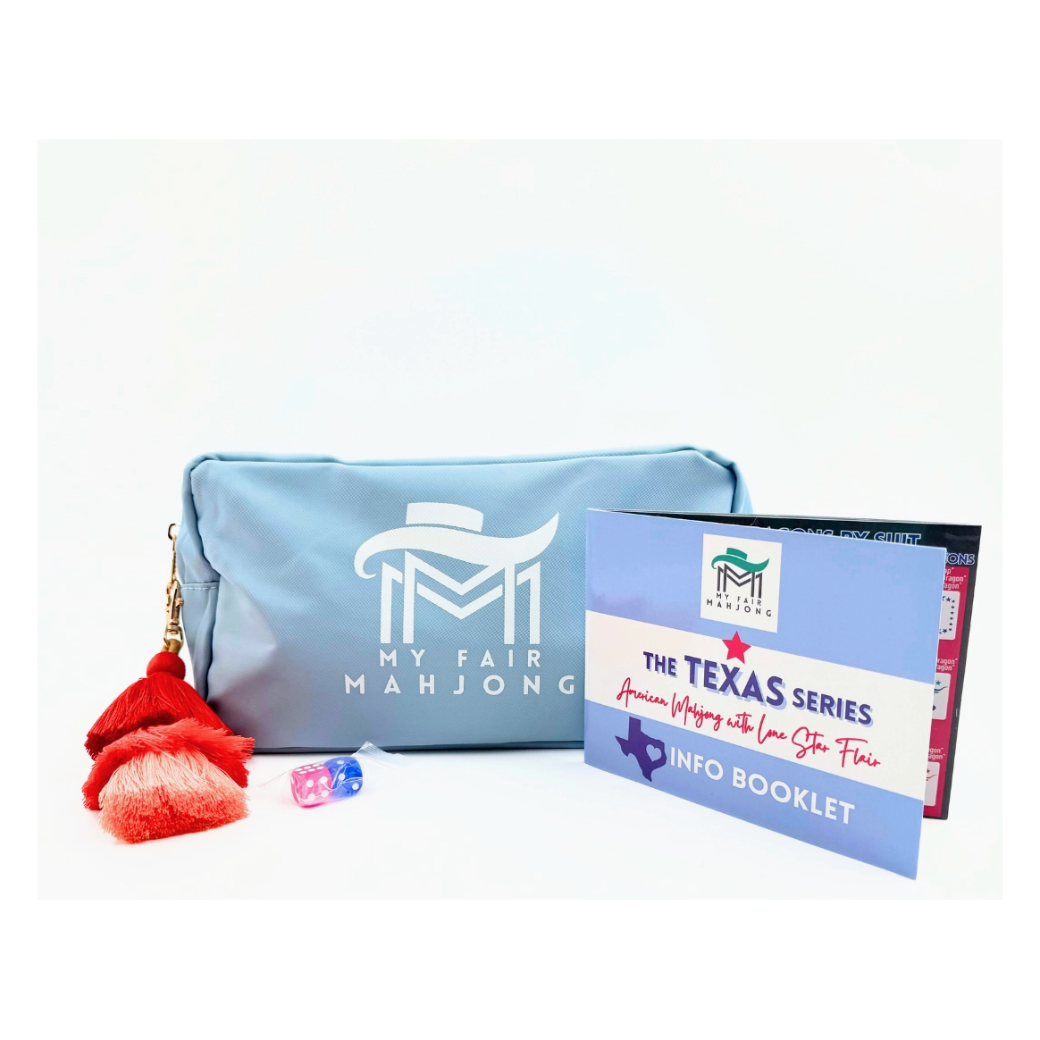The My Fair Mahjong Texas Series includes: * 1 MFM Light Blue Tile bag so that you can conveniently carry and store your tiles. * 1 Red Zipper Tassel to add a little pizzaz. * Card with Basic Instructions, Important Tips and Infographics to help get you started. * 160 Tiles in a faint light pink color acrylic: