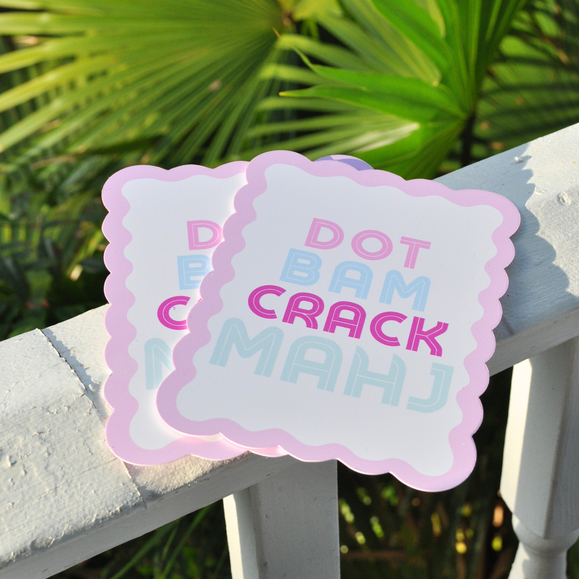Pastel DOT, BAM, CRACK, MAHJ motif with pink scalloped edges.