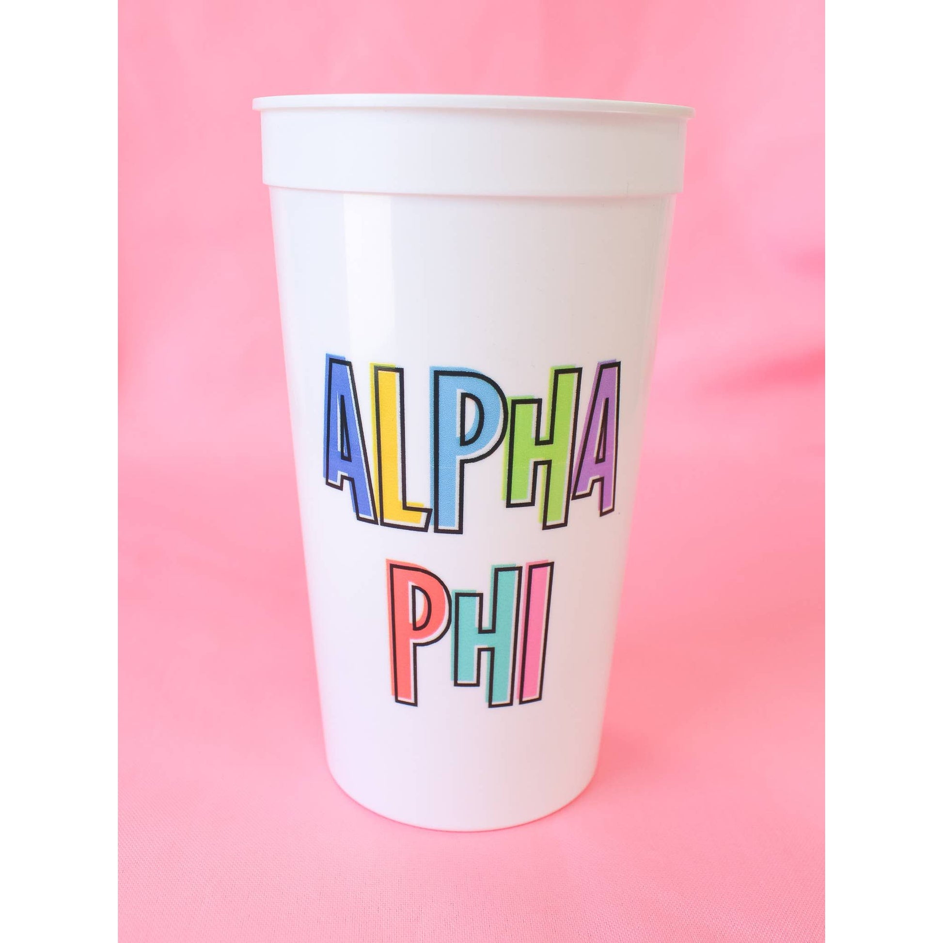 Each cup features your sorority name in playful, bold, multicolored lettering that’s sure to stand out in every group pic. Durable, reusable, and totally Insta-worthy, it's the ultimate must-have for every sorority girl’s collection.